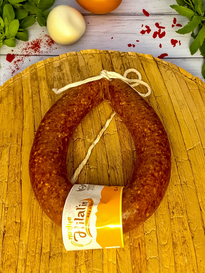 Bu ürünümüz sadece ve sadece etten mamul. Eskiden eti kıyma haline getirip baharatlarla karıştırıp kurutmaya asarlarmış. Fermente sucuk budur işte, mis gibi sinirsiz hafif yağlı et sadece baharatlarla kendi kendine içten içe fermente olur. Suyunu kaybeder, kurur, lezzeti ortaya çıkar. Biz de işte bu yüzlerce sene öncesinden lezzeti getiriyoruz size tertemiz hali ile. Sadece ve sadece et, ve baharat ile tertemiz bir ürün.